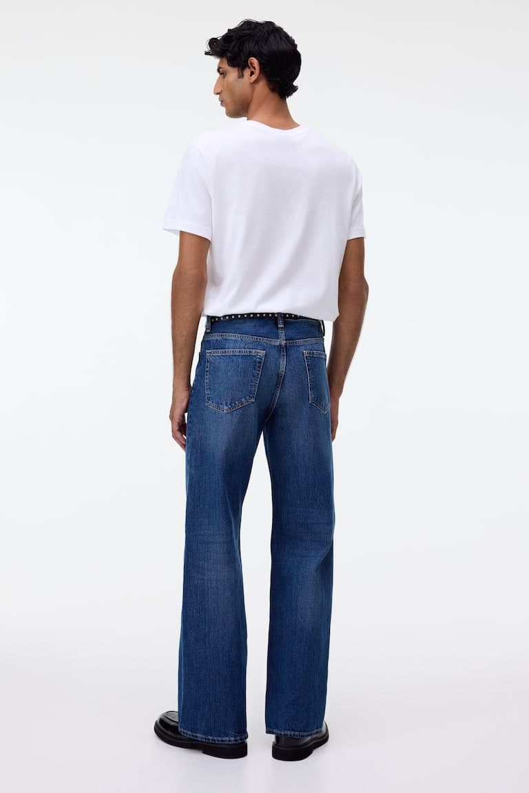 Джинсы с пятью карманами из плотного хлопкового денима. Прямые штанины и свободный крой от сиденья до низа, заниженная мотня и дополнительное пространство по всей длине штанины. Стандартная талия и ширинка на молнии.