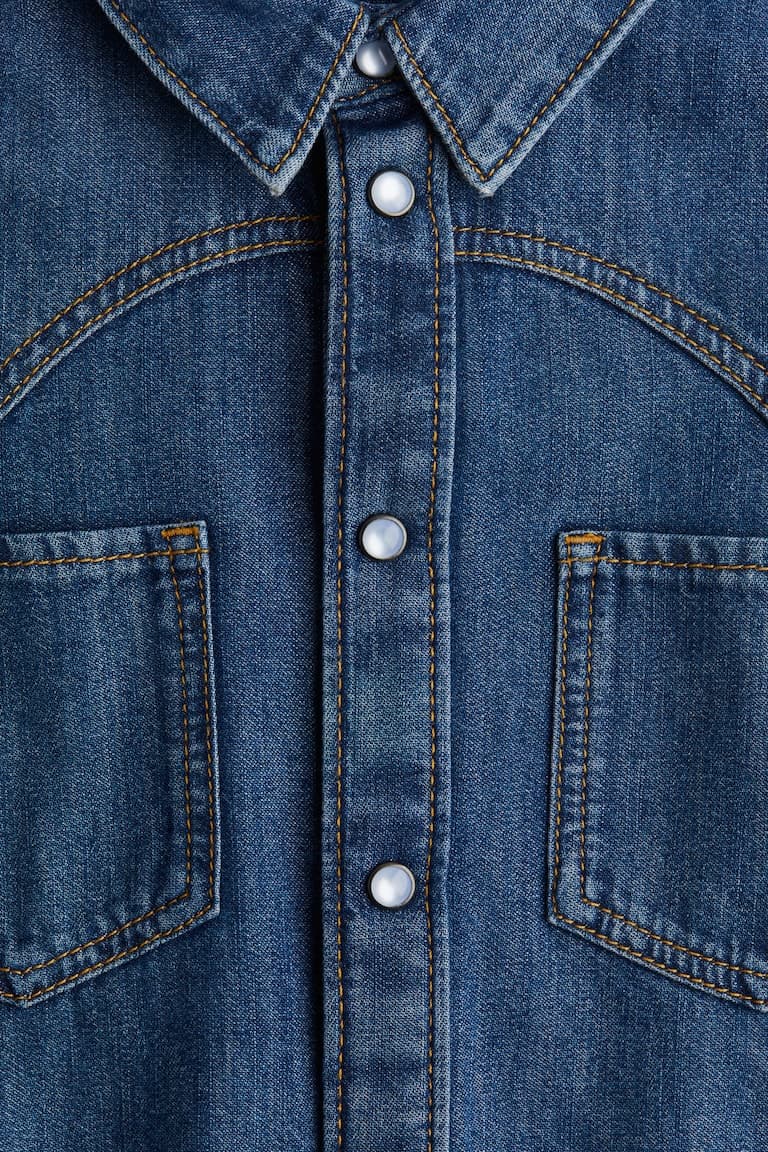 Рубашка с длинными рукавами из хлопкового денима. Отложной воротник, кокетка, застежки-кнопки спереди и открытые нагрудные карманы. Заниженная линия плеч, застежки-кнопки на манжетах и закругленный подол.Состав