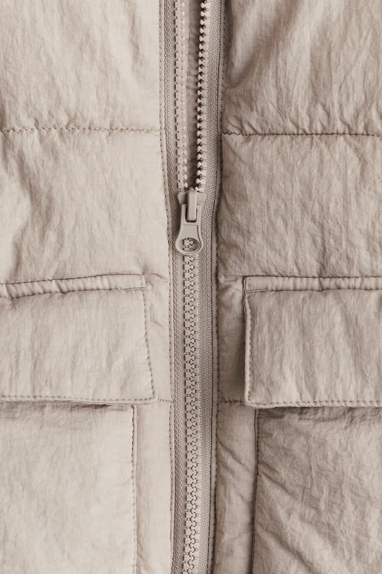 Стёганый жилет из нейлона с наполнителем, воротником-стойкой и молнией с защитой подбородка спереди. Накладные передние карманы, эластичная кромка по низу. На подкладке.Состав