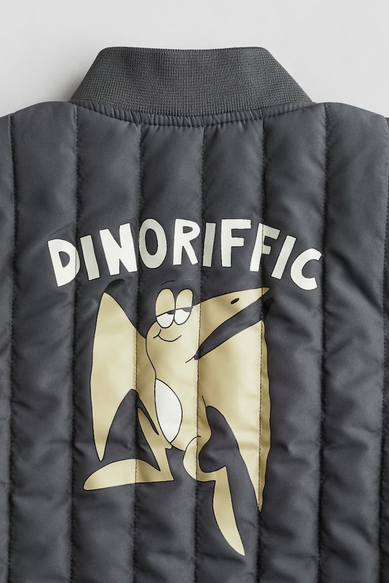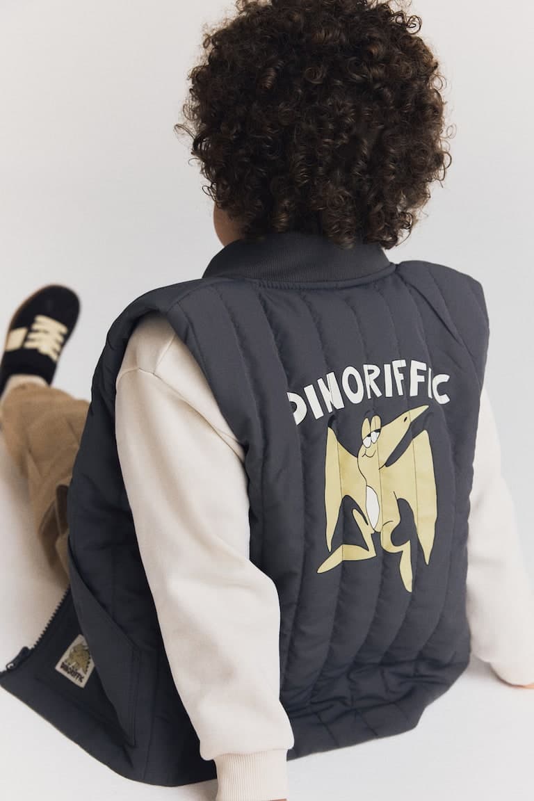 Легкий утепленный жилет из стеганой ткани с принтом на спине. Отделка в рубчик на воротнике-стойке, молния с защитой подбородка и накладные карманы спереди. На подкладке.Состав