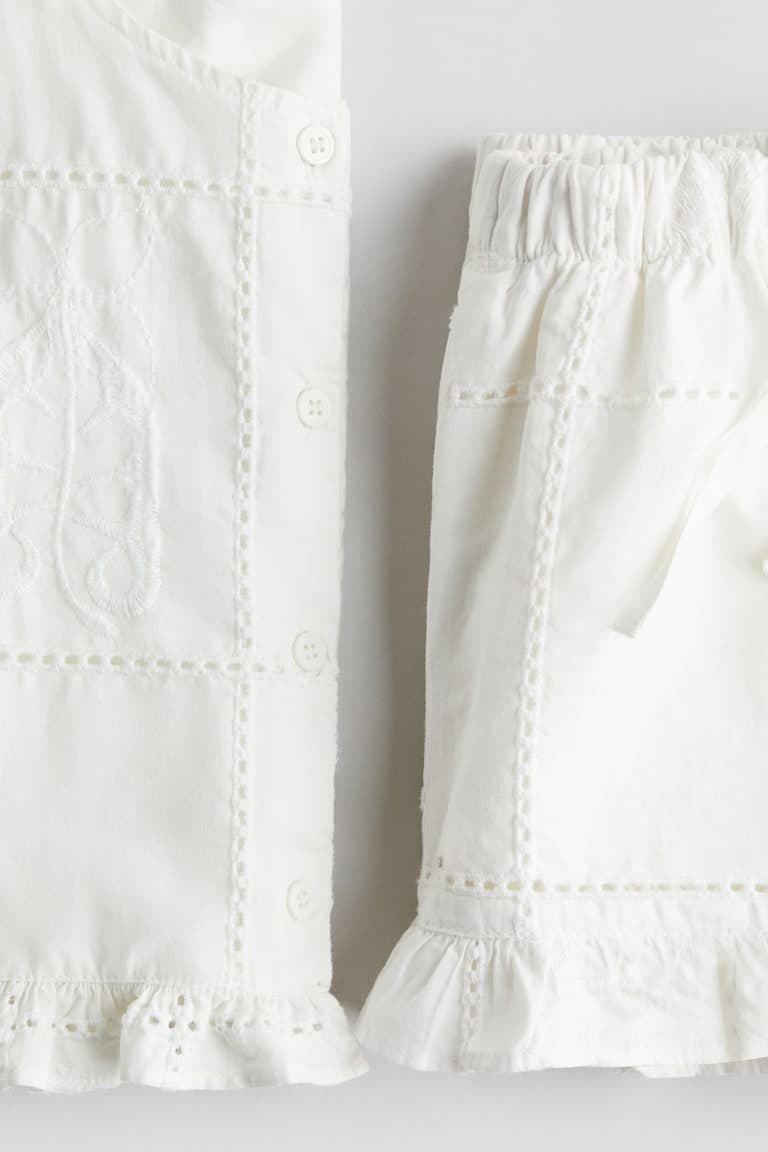 Комплект, состоящий из топа и шорт из мягкого хлопкового поплина с вышивкой в стиле «бродери англез» и вышитыми мотивами. Топ без рукавов с круглым вырезом горловины, пуговицами спереди и оборкой по краю. Шорты с эластичной кулиской на талии и оборками по краям.Состав