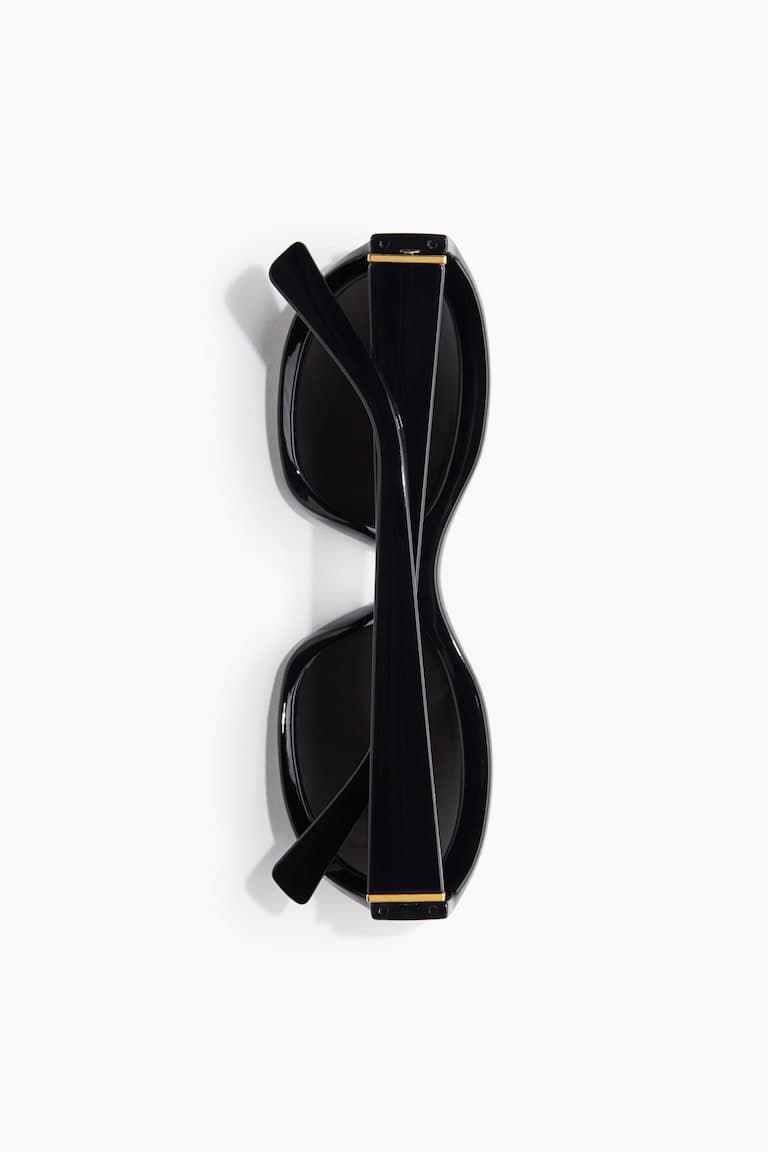 Овальные солнцезащитные очки с пластиковой оправой и дужками. Тонированные пластиковые линзы с защитой от УФ-лучей. Дужки с золотистой металлической деталью, добавляющей элегантности.Состав