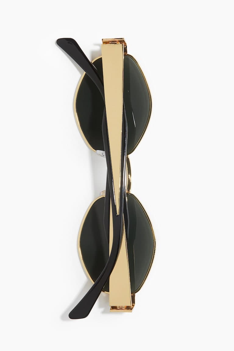 Шестиугольные солнцезащитные очки с металлическими оправами и дужками из металла и пластика. Регулируемые носоупоры и тонированные пластиковые линзы с защитой от УФ-лучей.Состав