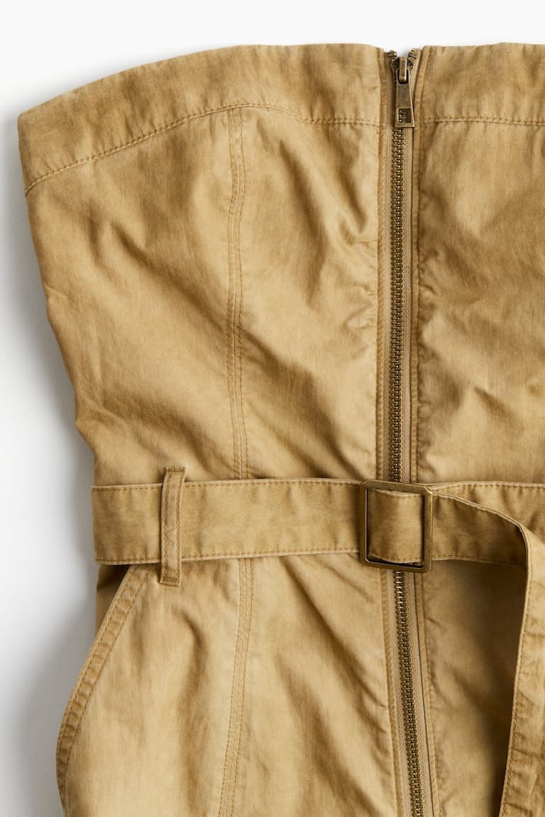 Комбинезон-бандо из ткани с видимыми швами спереди и сзади. Застежка-молния спереди, диагональные боковые карманы и съемный регулируемый пояс с металлической пряжкой. Широкие штанины с накладными карманами с клапаном.Состав