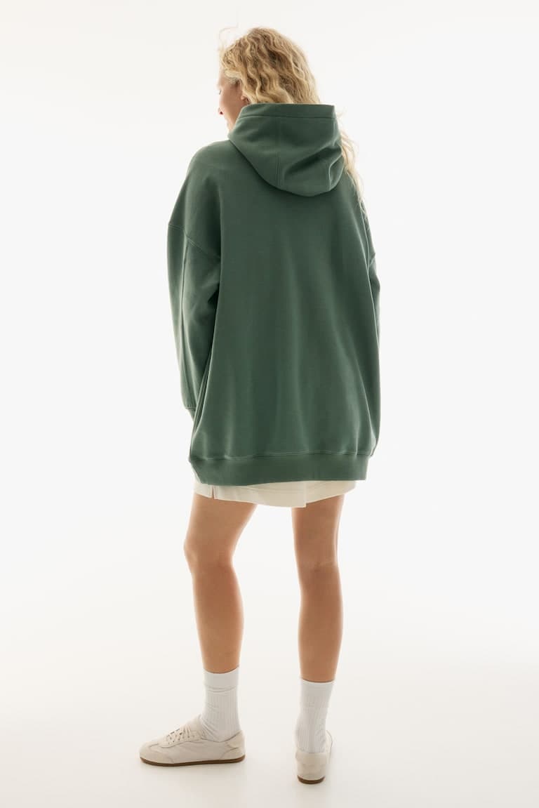 Короткое платье свободного кроя из ткани для толстовок с мягкой ворсистой внутренней стороной. Капюшон на подкладке с запа́хом, низкая линия плеч и длинные рукава.